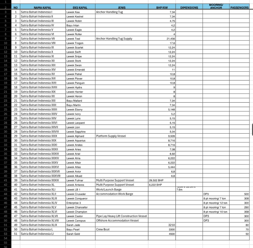 | 1 | SATRIA BAHARI INDONESIA I | Lewek Kea | Anchor Handling Tug | 7,340 BHP | GT.2300/No.1234/Ka | AKTIF |